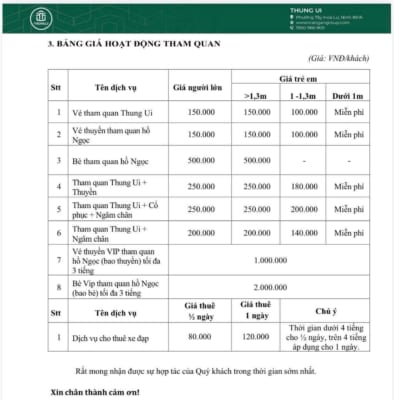 Giá vé là yếu tố then chốt để bạn lên kế hoạch chi phí. Hệ thống giá vé tại Thung Ui được niêm yết rõ ràng, minh bạch: